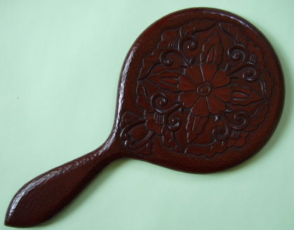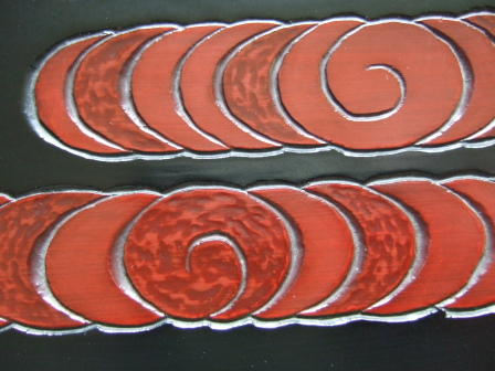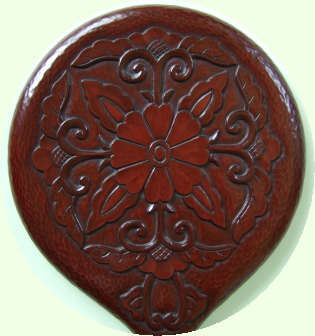 ◆仏通寺牡丹唐草文様の掛け鏡です。 これは彫るのが大変で、生徒さんをずいぶん励ました 記憶があります。でも、結果的には上々の出来栄えで 会心の作品に仕上がりました。 塗りは、弁柄蒔きと黒干口塗りの塗り分けです。【光】 |