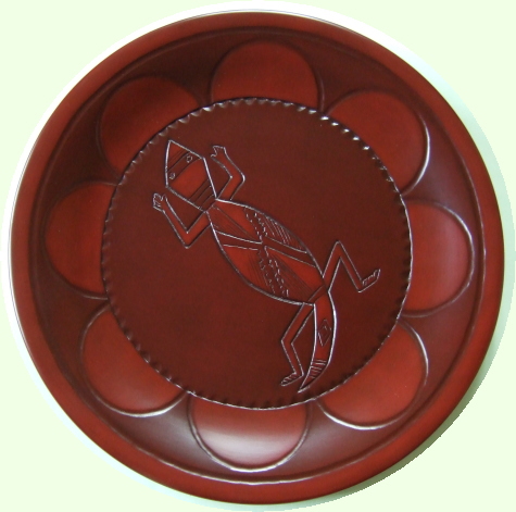 | ◆トカゲ文様の丸皿(:直径24センチ)です。オリジナルはネイティブ・アメリカンの陶器のお皿(17~18世紀頃)で、 バックナンバー(5)と(6)に、同系統の姉妹作品が紹介されています。 トカゲの形状や文様は、オリジナルの絵柄をほぼ忠実に再現しており、素朴な温か味が伝わってきます。 丸刀で柔らかく彫り込まれた八枚の花弁型のしゃくりが、中央部の硬質なキメ彫りと対称的で、 心地好いバランスを醸し出していると思います。 身近な動物を可愛らしくデザイン化できるネイティブ・アメリカンの感性が、ちょっとうらやましくなります。 この作品では、トカゲの“5本指”がとても“キュート”です! 【魁】 |