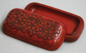 | ◆桜文様の眼鏡入れです。 図案は作者のオリジナルで、たくさんの桜花を重ね彫りしています。 桜の花芯部の彫り方には、雄しべの葯を丹念に彫り出す方法と、 雌しべだけを浮き彫りにする略式法がありますが、 作者は、表現がくどくならないように両者をバランス良く混合して彫っており、 絵付けの時点で完成時のイメージを明確に描いていたことが窺えます。 側面全体に細かい刀痕を打ち、その刀痕を赤研ぎで黒中漆まで研ぎ出して、 使い込んだ根来塗りの風合いを出しています。 画像では分かりにくいですが、一番深いところで4ミリくらいの深さがあり、 間近に見ると“彫ってるな〜”という迫力が伝わってくる作品です。 【この作品の塗師は、資料が散逸して特定できませんでした】 |