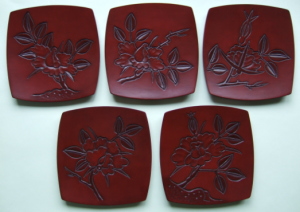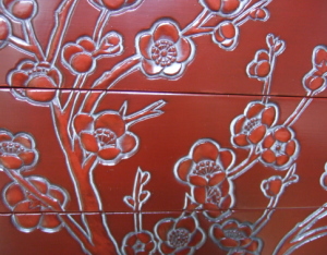 ◆梅文様の忘れな盆です。デザインは作者のオリジナル。変わった枝ぶりだと思いましたが、後日、青梅の梅林でこれとそっくりの梅樹を発見して驚いたことがあります。(青梅の梅樹の枝は、添え木で支えてありました。)【光】 |
