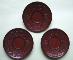 | ◆??文様の箸箱です。デザインは、古い経巻の縁金飾りの文様を参考にしたと思いますが、いま一つ定かでありません。たちこみと薬研が正確にこなされていて、刀痕も味わい深く、上々の出来栄えでした。蓋の側面には、麻布が着せてあります。【魁】 | ◆鉄線唐草文様の銘々皿です。中央の鉄線唐草は古い工芸文様をアレンジしたもの。周囲のくずしは手彫りによるものです。丹念に彫り込まれた八方刀痕に、穏やかな風情が漂っています。 【光】 |