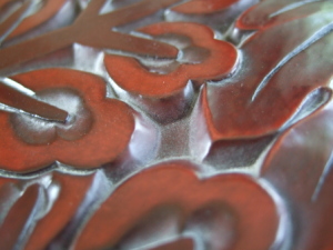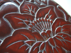 | ◆菊水文様の角皿(30センチ四方)です。 流水・菊花文様は作者が図書館で見つけた染織資料に取材し、波頭の部分を講師が後から描き足しました。 制作工程は、まず花文様と波頭の部分を刀痕を残さぬように浮き彫りにし、その後、流水文様を自由角度の片薬研(:かたやげん。片方を立て、片方を寝かせて角度操作しながら彫る薬研彫り)で彫り分けました。 塗りは本朱一色の干口塗りの研ぎ分けで、流水文様と花文様の“白い輪郭線”は、すす玉・イボタ蝋の古美粉蒔き(ふるびこまき)によるものです。 この作品は、彫刻表現のバランスの良さがきわだっており、ひと目で作者の美的センスの健全さが読み取れます。塗りも、図案の長所を存分に活かしていて、彫りと塗りの息が絶妙に呼応していると思います。 【魁】 |