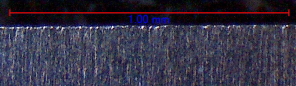| ⑪:“敷内曇り”の研ぎ汁です。 条件は⑦と同じです。 素晴らしく灰色です。 刃金をたくさん下ろした感じです。 ![]() ⑬:参考のため、刃の黒幕#2000の 研磨条痕を貼付します。 上部3分の1が、刃金です。 |